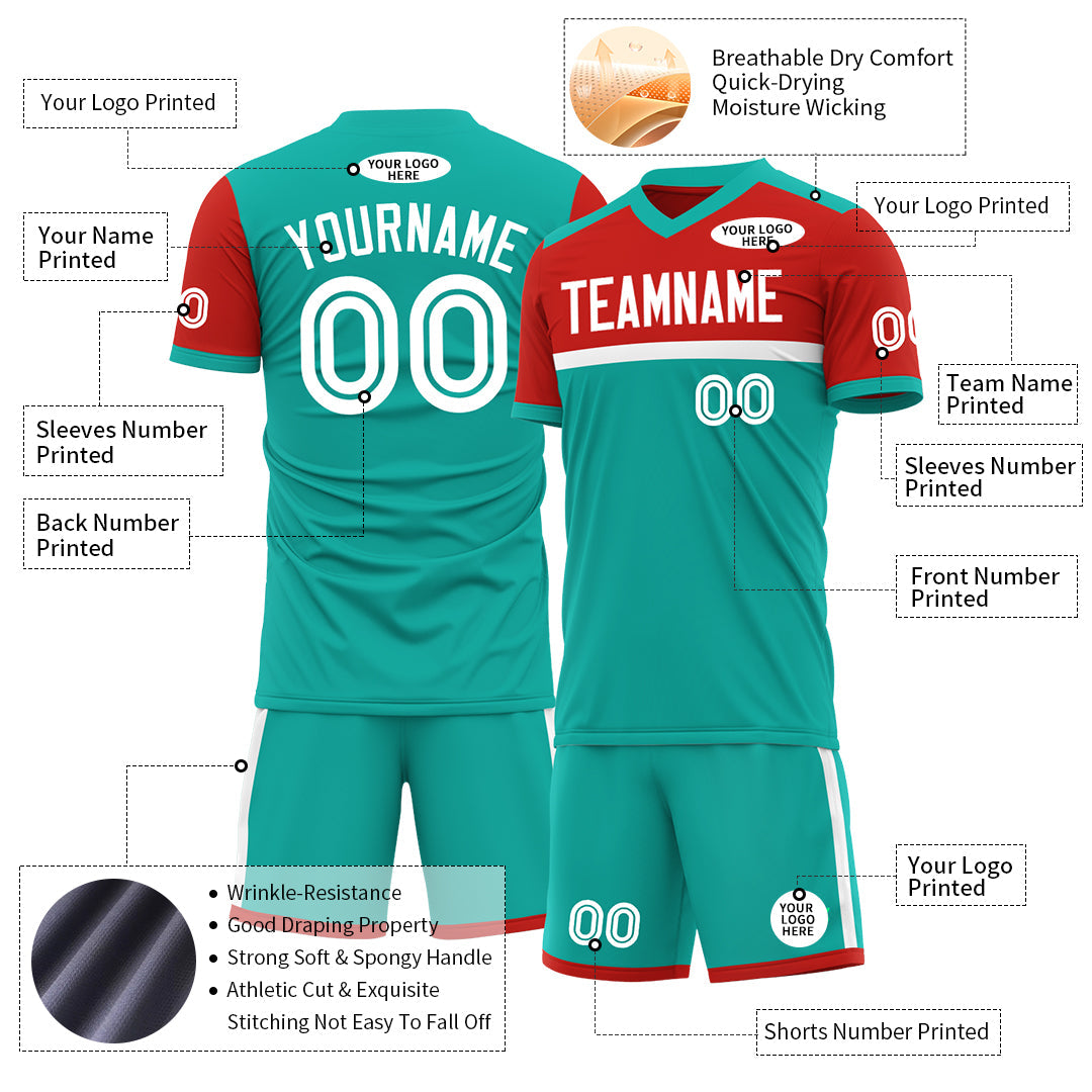 Our custom aqua soccer jersey is really cool. It's made of good fabric, strong and comfy. The aqua color looks great. You can put your team name, logo, or a fun design on it. Change the font and size of the text. The sleeves and collar have different styles. The buttons or snaps can be made special. We have many sizes. It's good for soccer teams to look united and stylish. Fans can wear it too. You can wear it to games, practice, or just for fun. This jersey has quality, cool customization, and a nice style. It's a great choice for soccer lovers.