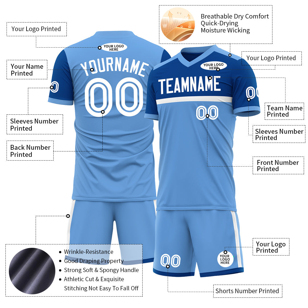 Personalized Light Blue Soccer UniformIntroducing our exceptional soccer uniform that Varied latest designed pattern styles, unique collar design, functionality, offering a perfect fit for every member of your team. With this high-performance apparel, you can play like a pro while exuding confidence and style....- $28.99