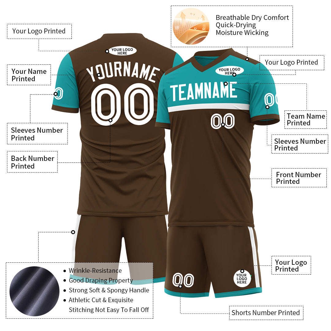 Our custom brown soccer uniform is really good. The jersey is made of quality fabric that's both durable and comfortable. It has a nice brown color. You can customize the jersey with your team's name, logo or a design. The font and size of the text can be changed. The sleeves and collar have different styles. The buttons or snaps can be made to your liking. The shorts are made of good material too. They have an adjustable waistband and come in different lengths. There are many size options for both the jersey and the shorts. It's great for soccer teams to look stylish and united. Fans can wear it to show support. You can wear it for games, practices or casually. This uniform has good quality, great customization and a nice look. It's a great choice for soccer lovers.