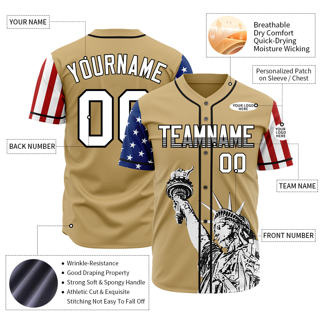 Personalized Gold USA Flag Baseball Jersey Shirt Create your own design: adding your name, Number, Team logo, or special graphics, With intricate embroidery, Every stitch is carefully embroidered for a professional and eye-catching look. Made from high-quality materials, our jersey offers comfort and durability...- $28.99
