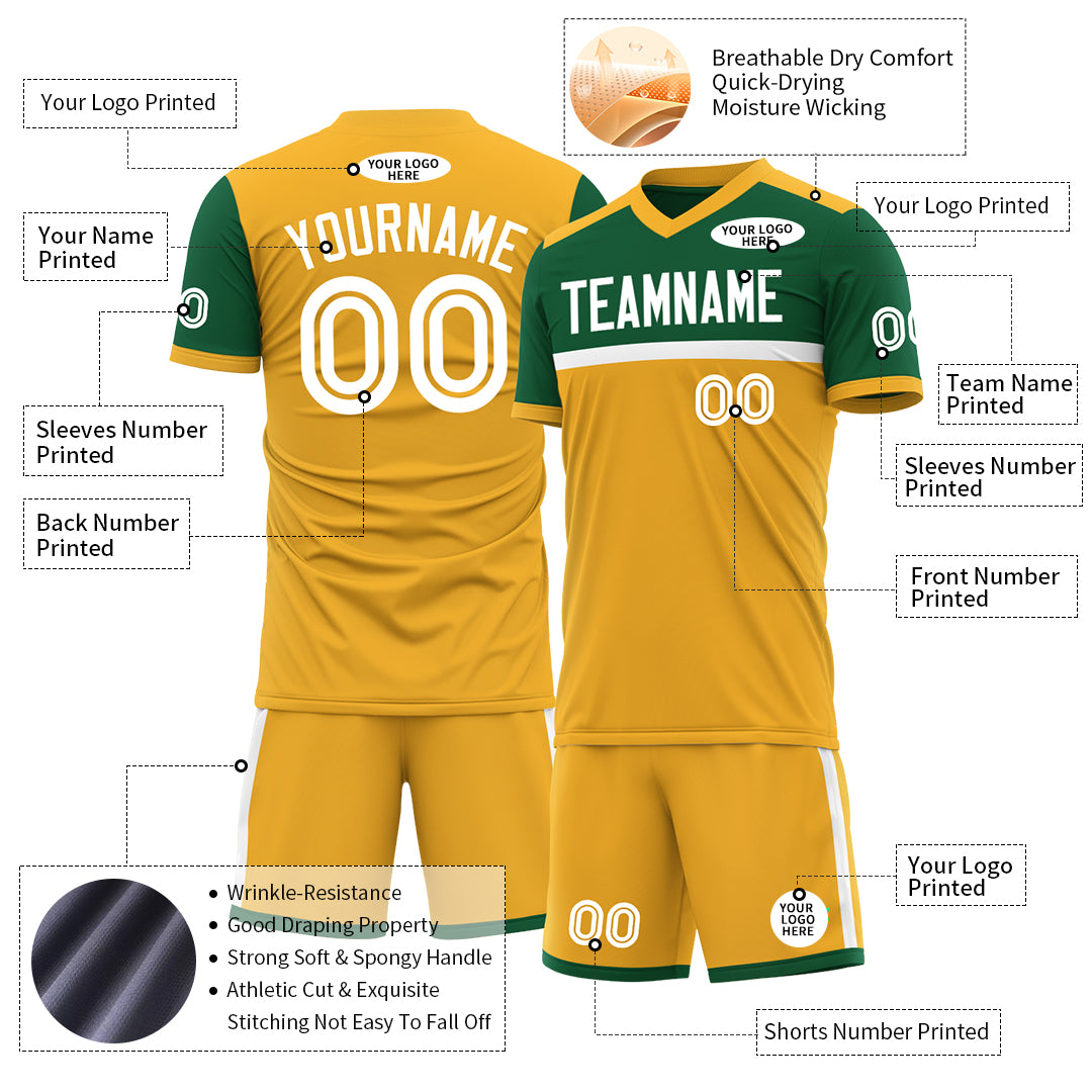 There are multiple sizes available to fit every player. This jersey is perfect for soccer teams to present a professional and unified look during matches and training. It's also a great item for fans to show their support. Whether you're in the middle of a competitive game, a practice session, or just going about your day, this custom gold soccer jersey combines superior quality, extensive customization, and a stylish look. It's an ideal choice for soccer enthusiasts.