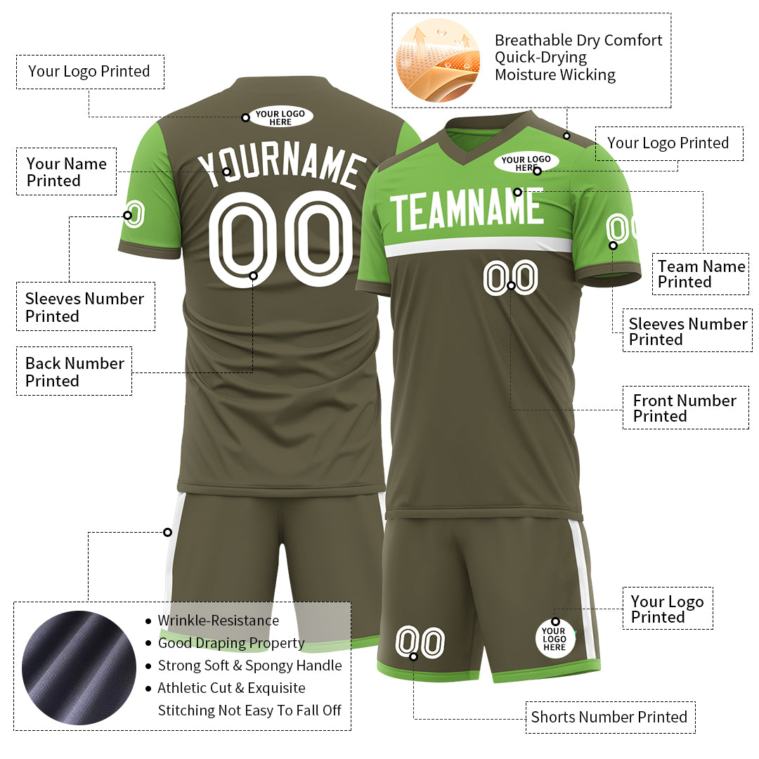 Our custom olive soccer uniform is a top-of-the-line option for soccer aficionados, bringing together functionality, style, and a sense of team identity.