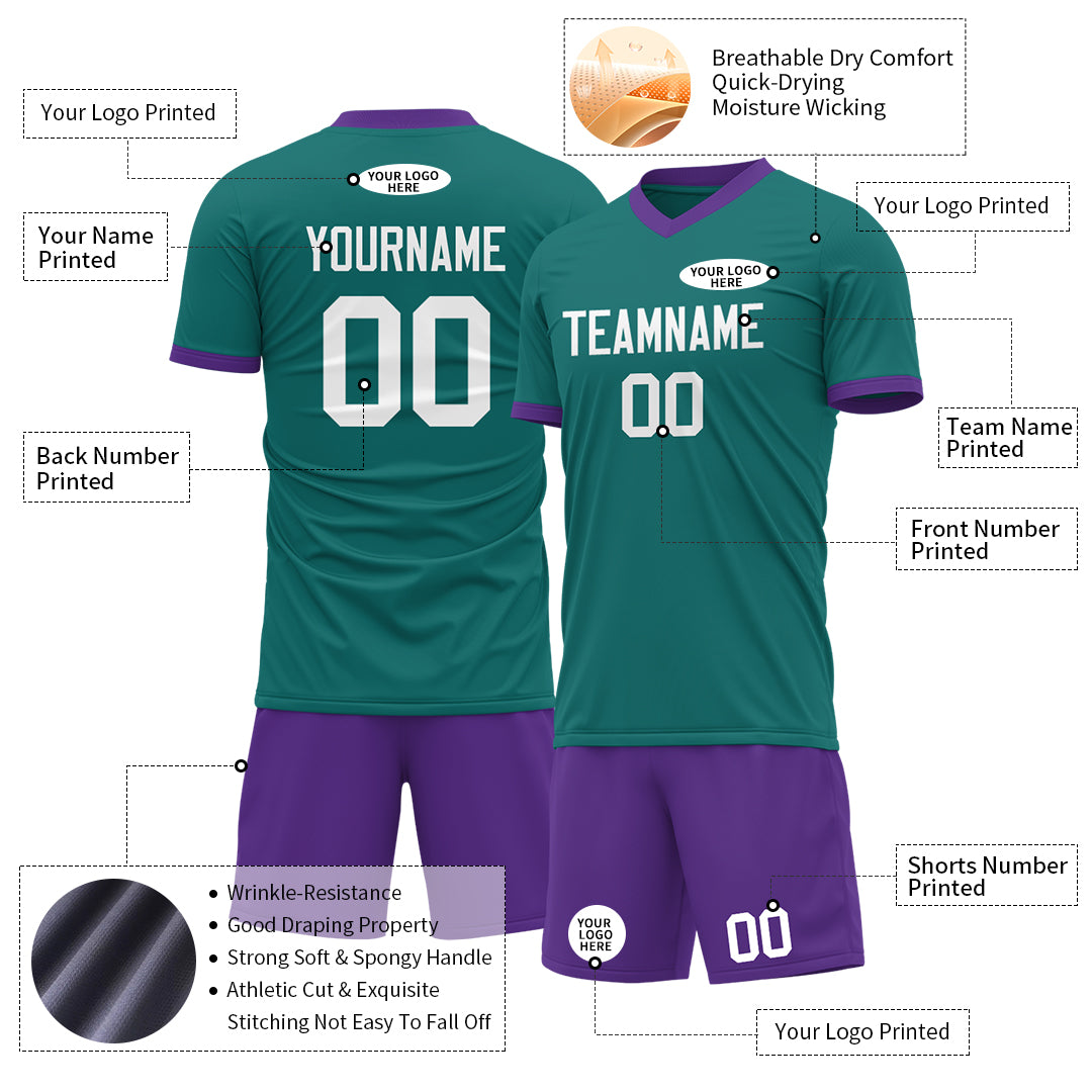 Our custom teal soccer jersey is a wonderful option for soccer lovers. Made from high-quality fabric, it's both durable and comfortable, able to withstand the demands of the soccer pitch during intense matches. The teal color gives it a unique and eye-catching look.