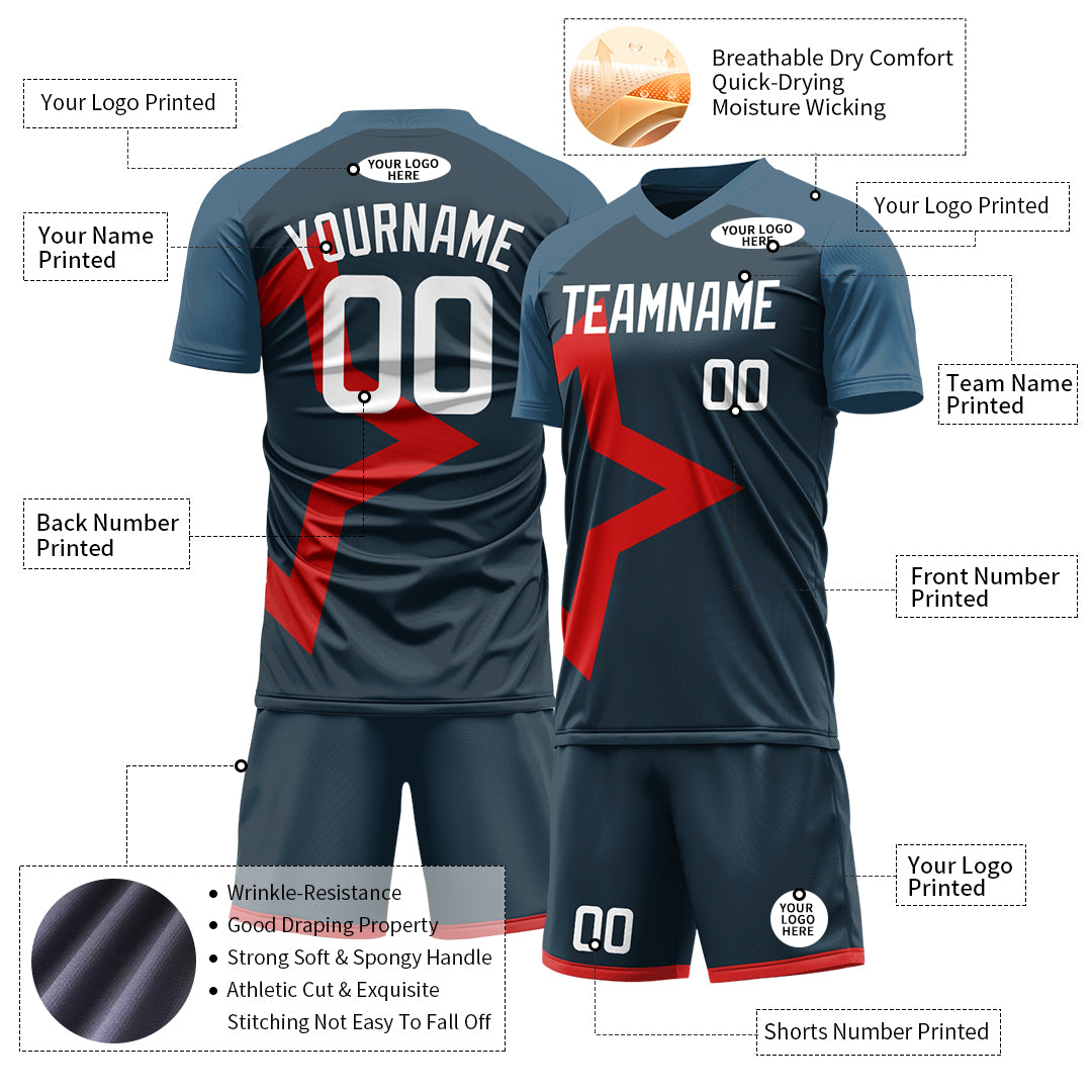 Personalized Navy Soccer Team UniformIntroducing our exceptional soccer uniform that Varied latest designed pattern styles, unique collar design, functionality, offering a perfect fit for every member of your team. With this high-performance apparel, you can play like a pro while exuding confidence and style....- $28.99