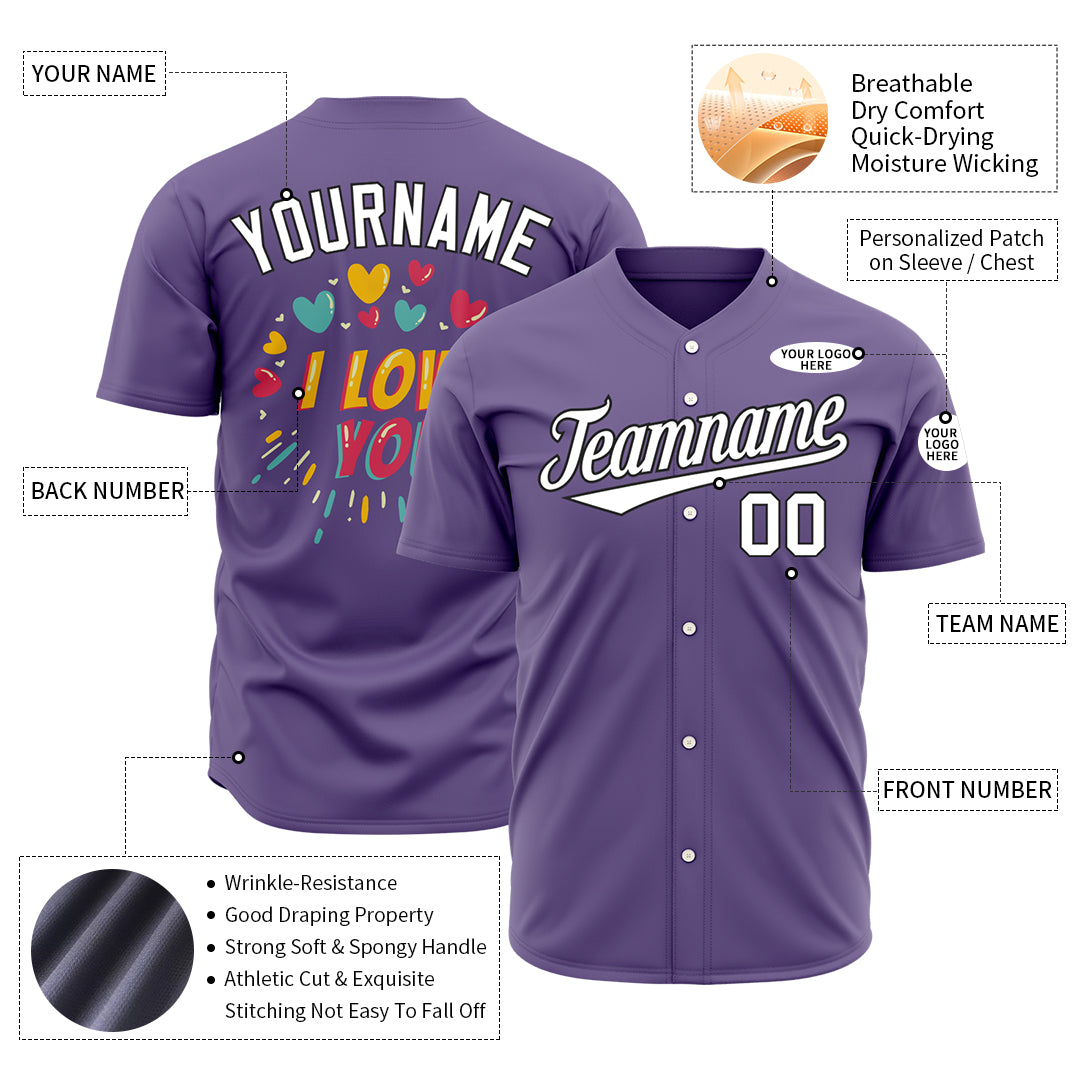 Custom Light Purple Valentine's Day Baseball Jersey Full Button Down Fans Special Edition Authentic Shirt