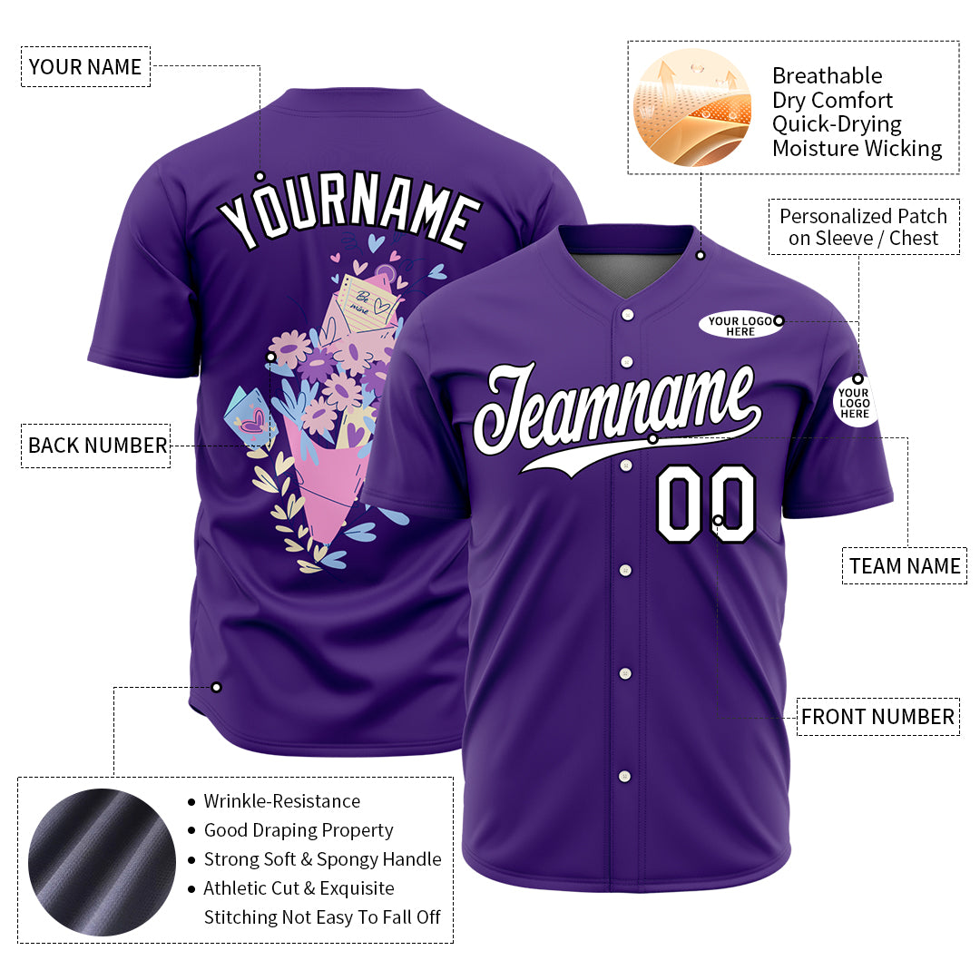 Custom Purple Valentine's Day Baseball Jersey Fans Special Edition Authentic Full Button Down Shirt